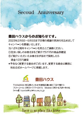 豊田ハウスは2月をもちまして創業2周年を迎えます。この節目の年を無事に迎える事が出来ました事は、皆々様の多大なるご支援の賜物と心より感謝申し上げます。ささやかながらスタッフ皆でお祝いしました!また日頃の感謝を込めまして5月5日までご新居ご紹介キャンペーンを開催いたします。お住い探しのお客様を豊田ハウスにご紹介いただいた時点で5千円の商品券贈呈、さらにそのご紹介いただきましたお客様が豊田ハウスにてご契約していただいた場合、現金10万円を贈呈させていただきます。ご新居お探しのお身内の方やお知り合い方などおられましたらお気軽にご紹介下さい。誠心誠意、ご対応させていただきます!!